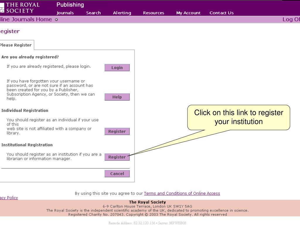 First steps • From Moldova home page click on ‘Royal Society of London’ link • Gives details of the resources available • Go the ‘How do I gain access’ section • Register with Metapress (service provider for RSL)