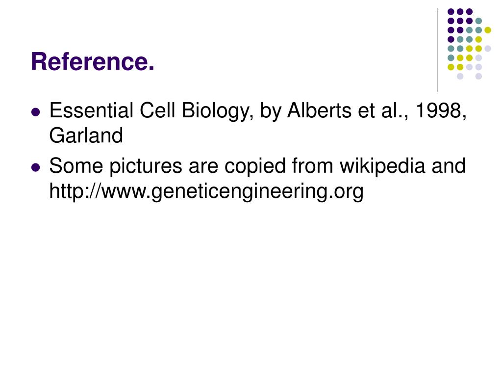 Reference. • Essential Cell Biology, by Alberts et al., 1998, Garland • Some pictures are copied from wikipedia and http://www.geneticengineering.org