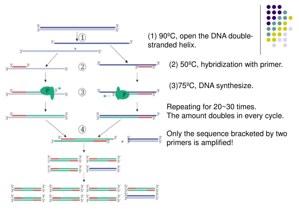 (1) 90ºC, open the DNA double-stranded helix. (2) 50ºC, hybridization with primer. (3)75ºC, DNA synthesize. Repeating for 20~30 times. The amount doubles in every cycle. Only the sequence bracketed by two primers is amplified!