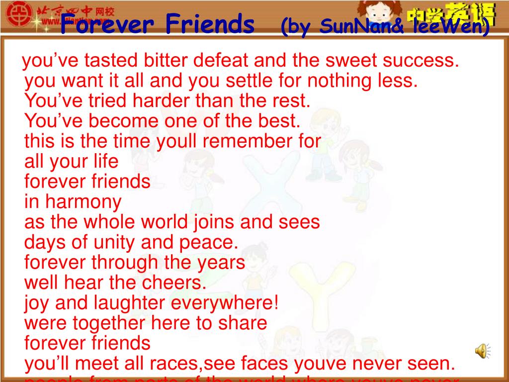 Forever Friends (by SunNan& leeWen) you’ve tasted bitter defeat and the sweet success. you want it all and you settle for nothing less. You’ve tried harder than the rest. You’ve become one of the best. this is the time youll remember forall your life forever friends in harmony as the whole world joins and sees days of unity and peace. forever through the years well hear the cheers. joy and laughter everywhere! were together here to share forever friends you’ll meet all races,see faces youve never seen. people from parts of the world where youve never been. and you’ll feel it in your heart we spent too much time apart this is the time when all dreams of man come alive. bridge(no matter where we are or go) (no matter what we hope for or know) (no matter how we word our prayer) (there is one dream we share) endingone world one dreamforever friendsin harmony!forever friedns(one dream we dream,)(one world we share.)