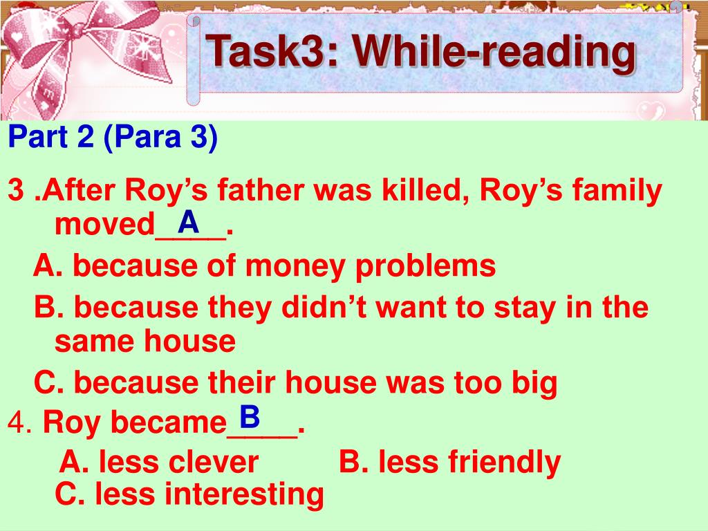 Task3: While-reading Part 2 (Para 3) 3 .After Roy’s father was killed, Roy’s family moved____. A. because of money problems B. because they didn’t want to stay in the same house C. because their house was too big 4. Roy became____. A. less clever B. less friendly C. less interesting A B