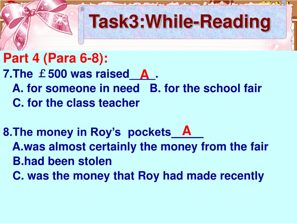 Task3:While-Reading Part 4 (Para 6-8): 7.The £500 was raised____. A. for someone in need B. for the school fair C. for the class teacher 8.The money in Roy’s pockets_____ A.was almost certainly the money from the fair B.had been stolen C. was the money that Roy had made recently A A