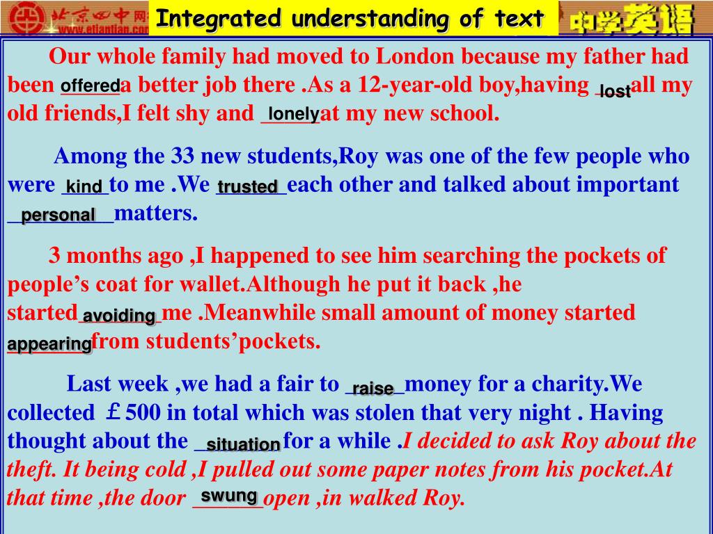 Integrated understanding of text Our whole family had moved to London because my father had been _____a better job there .As a 12-year-old boy,having ___all my old friends,I felt shy and _____at my new school. Among the 33 new students,Roy was one of the few people who were ____to me .We ______each other and talked about important _________matters. 3 months ago ,I happened to see him searching the pockets of people’s coat for wallet.Although he put it back ,he started_______me .Meanwhile small amount of money started _______from students’pockets. Last week ,we had a fair to _____money for a charity.We collected £500 in total which was stolen that very night . Having thought about the _______ for a while .I decided to ask Roy about the theft. It being cold ,I pulled out some paper notes from his pocket.At that time ,the door ______open ,in walked Roy. offered lost lonely kind trusted personal avoiding appearing raise situation swung
