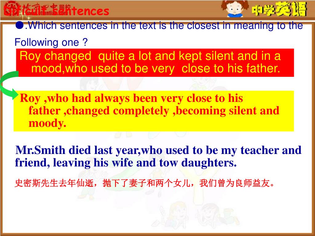 Dificult sentences ●.Which sentences in the text is the closest in meaning to the Following one ? Roy changed quite a lot and kept silent and in a mood,who used to be very close to his father. Roy ,who had always been very close to his father ,changed completely ,becoming silent and moody. Mr.Smith died last year,who used to be my teacher and friend, leaving his wife and tow daughters. 史密斯先生去年仙逝,抛下了妻子和两个女儿,我们曾为良师益友。