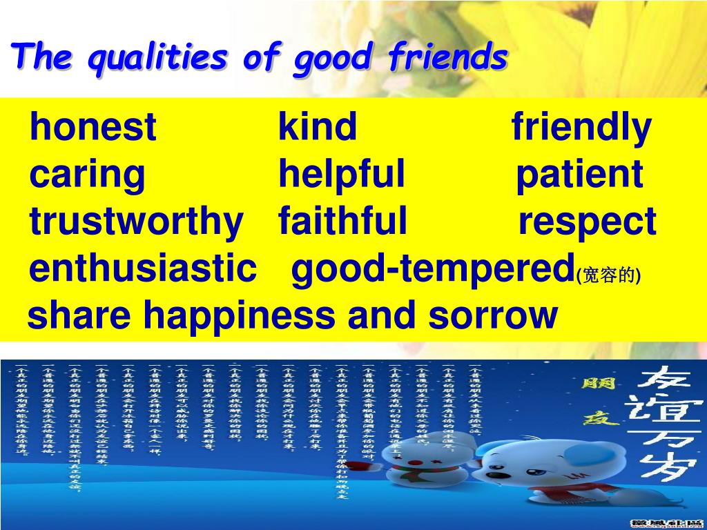 The qualities of good friends honest kind friendly caring helpful patient trustworthy faithful respect enthusiastic good-tempered(宽容的) share happiness and sorrow