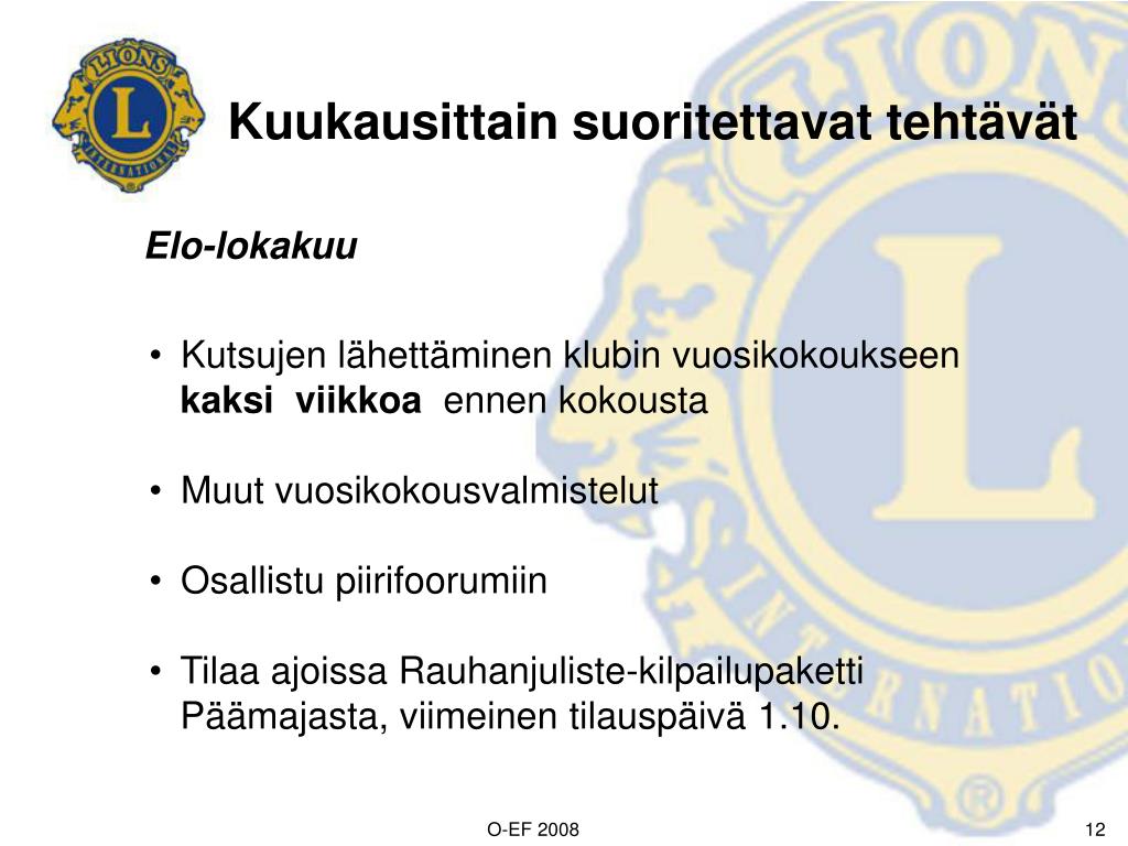Kuukausittain suoritettavat tehtävät Säännöt poissaolon korvaamiseksi Poissaolo klubin virallisesta kokouksesta voidaan korvata määräajan kuluessa –13 pv ennen kokousta, 13 pv kokouksen jälkeen - siten, että jäsen osallistuu johonkin seuraavista: 1. Jonkin toisen lions- tai leoklubin virallinen tai erikoiskokous 2. Oman klubin hallituksen kokous 3. Oman klubin toimikunnan kokous 4. Oman klubin jokin muu kokous 5. Oman klubin palvelu- tai varojenkeräysaktiviteetti 6. Alueen tai lohkon kokous • Kansainvälinen kongressi, vuosikokous, piirikokous tai mikä tahansa lionien virallinen kokous 8. Vierailu Lions Clubs Internationalin päämajassa Oak Brookissa, liittotoimistossa Helsingissä tai muun maan lionstoimistossa (vierailusta saa kortin, jossa on vierailuaika) 9. Katso vuosikirja s. A 50 kaudella 08-09.