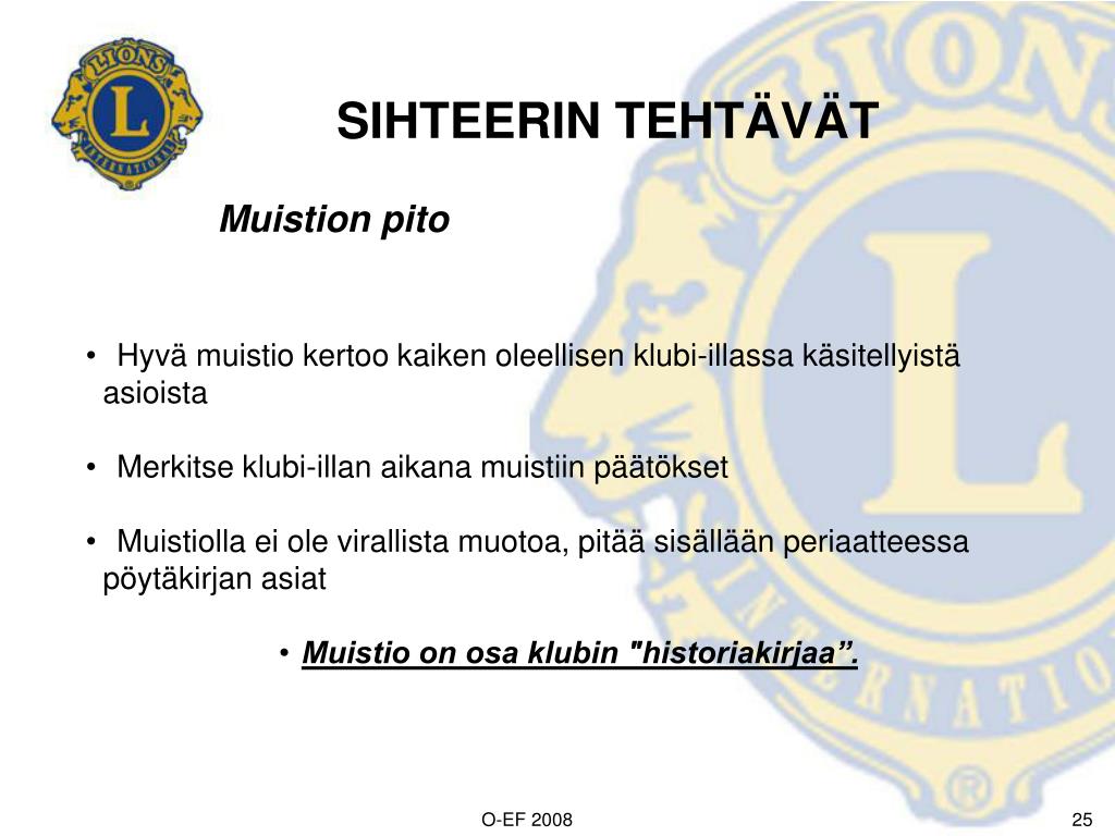 SIHTEERIN TEHTÄVÄT Muistionpito • Hyvä muistio kertoo kaiken oleellisen klubi-illassa käsitellyistä asioista • Merkitse klubi-illan aikana muistiin päätökset • Muistiolla ei ole virallista muotoa, pitää sisällään periaatteessa pöytäkirjan asiat • Muistio on osa klubin "historiakirjaa”.