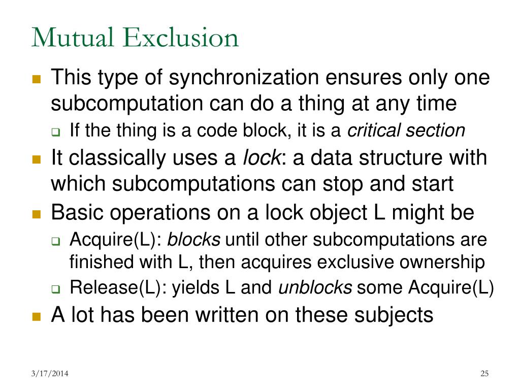 Mutual Exclusion • This type of synchronization ensures only one subcomputation can do a thing at any time • If the thing is a code block, it is a critical section • It classically uses a lock: a data structure with which subcomputations can stop and start • Basic operations on a lock object L might be • Acquire(L): blocks until other subcomputations are finished with L, then acquires exclusive ownership • Release(L): yields L and unblocks some Acquire(L) • A lot has been written on these subjects