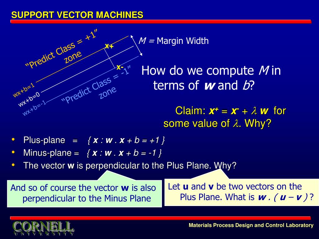 Plus-plane = { x : w . x + b = +1 } Minus-plane = { x : w . x + b = -1 } The vector w is perpendicular to the Plus Plane. Why? SUPPORT VECTOR MACHINES M = Margin Width x+ “Predict Class = +1” zone x- How do we compute M in terms of w and b? “Predict Class = -1” zone wx+b=1 wx+b=0 Claim: x+ = x- + lw for some value of l. Why? wx+b=-1 Let u and v be two vectors on the Plus Plane. What is w . ( u – v ) ? And so of course the vector w is also perpendicular to the Minus Plane