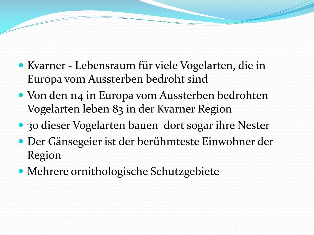 Kvarner - Lebensraum für viele Vogelarten, die in Europa vom Aussterben bedroht sind • Von den 114 in Europa vom Aussterben bedrohten Vogelarten leben 83 in der Kvarner Region • 30 dieser Vogelarten bauen dort sogar ihre Nester • Der Gänsegeier ist der berühmteste Einwohner der Region • Mehrere ornithologische Schutzgebiete