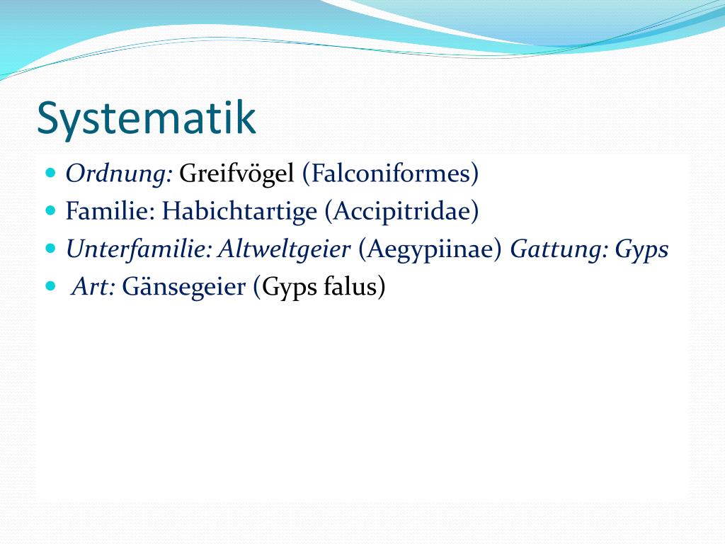 Systematik • Ordnung:Greifvögel (Falconiformes) • Familie: Habichtartige (Accipitridae) • Unterfamilie: Altweltgeier (Aegypiinae) Gattung: Gyps • Art: Gänsegeier (Gyps falus)