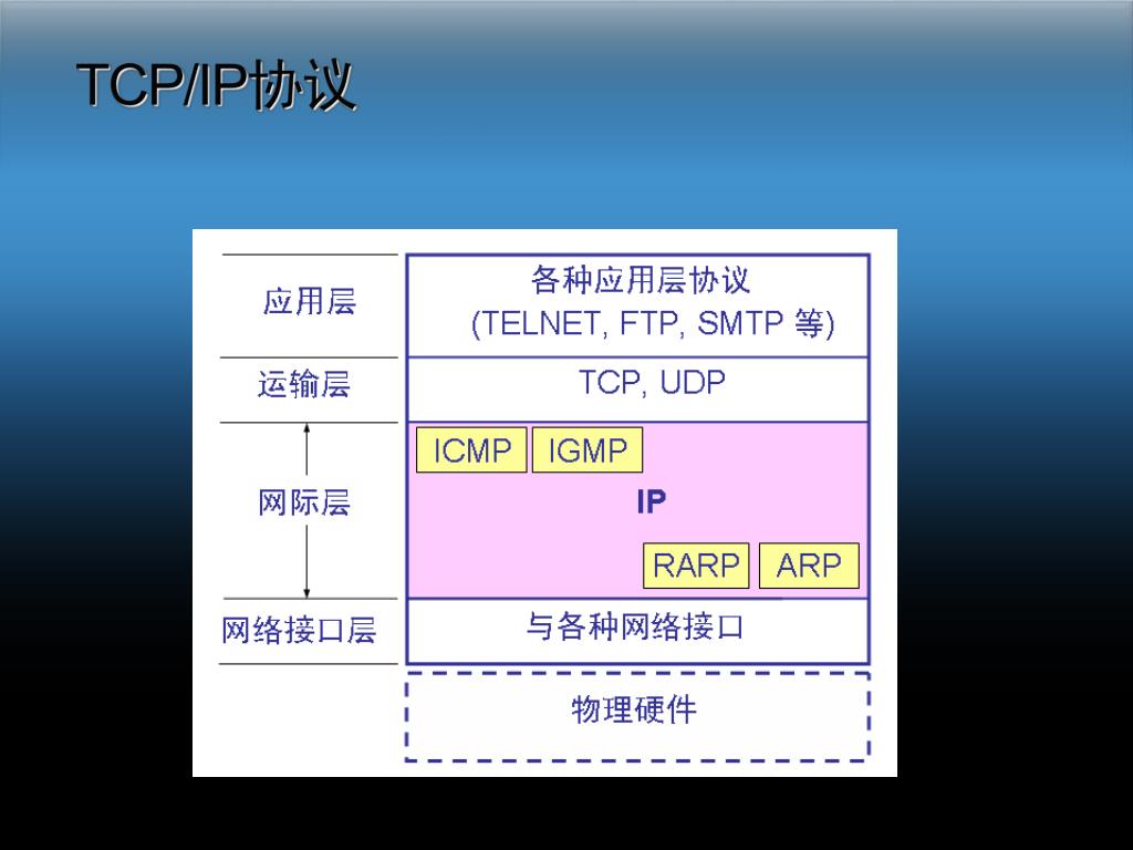 路由选择协议 • 内部网关协议—— RIP协议 • RIP(RoutingInformationProtocols,路由信息协议),是应用较早、使用较普遍的内部网关协议(Interior Gateway Protocol,简称IGP),适用于小型同类网络,是典型的距离矢量(distance-vector)协议 • RIP是基于UDP,端口520的应用层协议