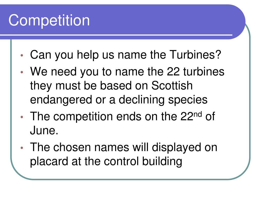 Competition • Can you help us name the Turbines? • We need you to name the 22 turbines they must be based on Scottish endangered or a declining species • The competition ends on the 22nd of June. • The chosen names will displayed on placard at the control building