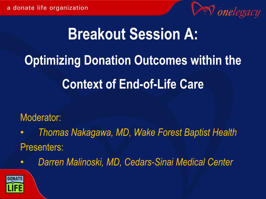 Breakout Session A: Optimizing Donation Outcomes within the Context of End-of-Life Care. Moderator: Thomas Nakagawa, MD, Wake Forest Baptist Health Presenters : Darren Malinoski, MD, Cedars-Sinai Medical Center. Optimizing Donation Outcomes within the Context of End-of-Life Care.