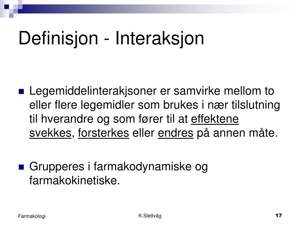 Definisjon - Interaksjon • Legemiddelinterakjsoner er samvirke mellom to eller flere legemidler som brukes i nær tilslutning til hverandre og som fører til at effektene svekkes, forsterkes eller endres på annen måte. • Grupperes i farmakodynamiske og farmakokinetiske. K.Slettvåg