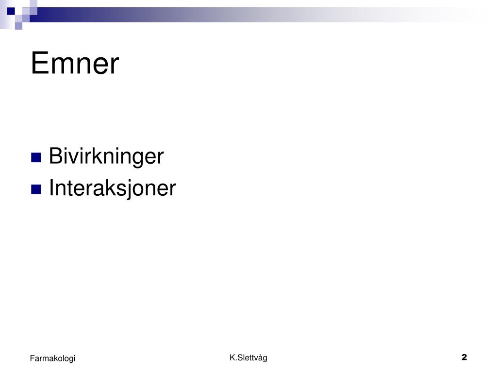 Emner • Bivirkninger • Interaksjoner K.Slettvåg