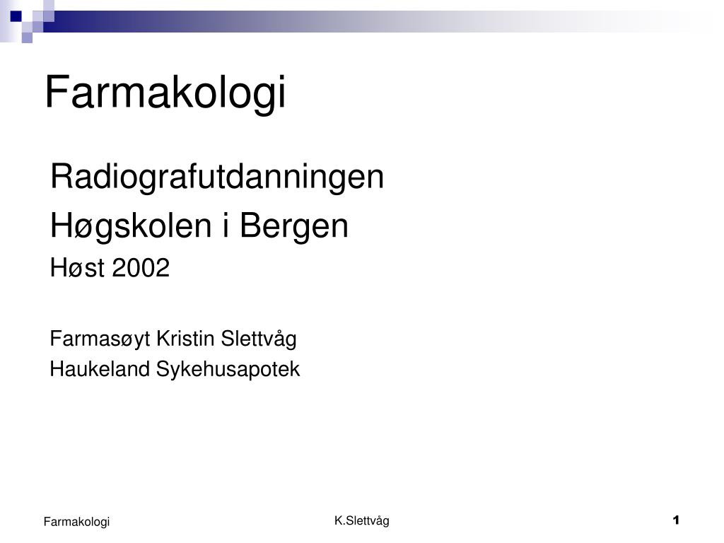 Radiografutdanningen Høgskolen i Bergen Høst 2002 Farmasøyt Kristin Slettvåg Haukeland Sykehusapotek Farmakologi K.Slettvåg
