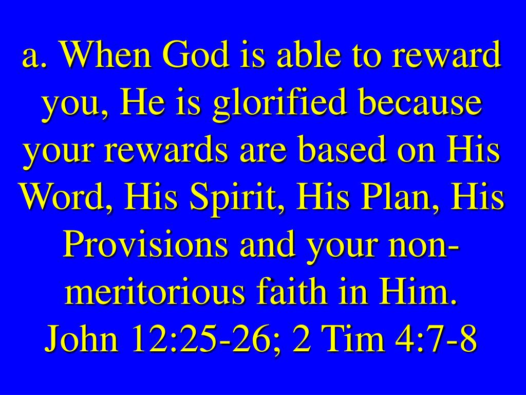 a. When God is able to reward you, He is glorified because your rewards are based on His Word, His Spirit, His Plan, His Provisions and your non-meritorious faith in Him. John 12:25-26; 2 Tim 4:7-8