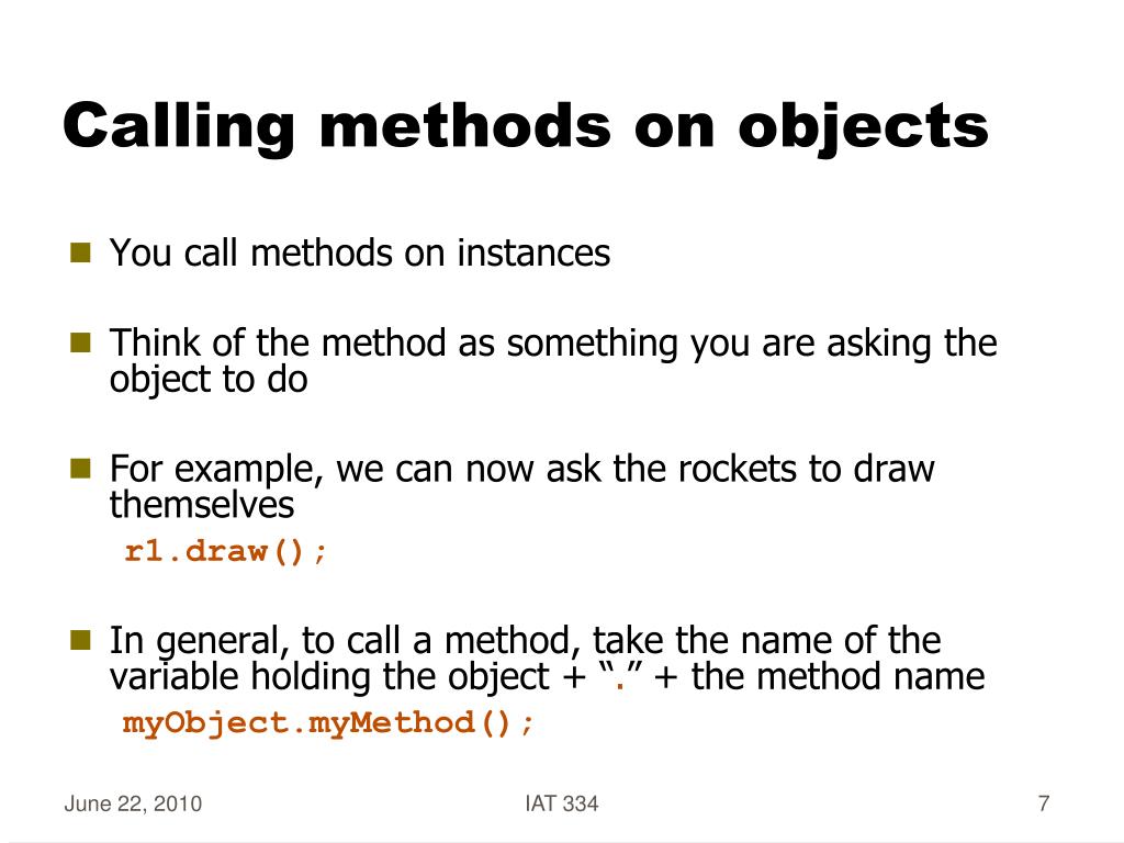 Calling methods on objects • You call methods on instances • Think of the method as something you are asking the object to do • For example, we can now ask the rockets to draw themselves r1.draw(); • In general, to call a method, take the name of the variable holding the object + “.” + the method name myObject.myMethod(); IAT 334