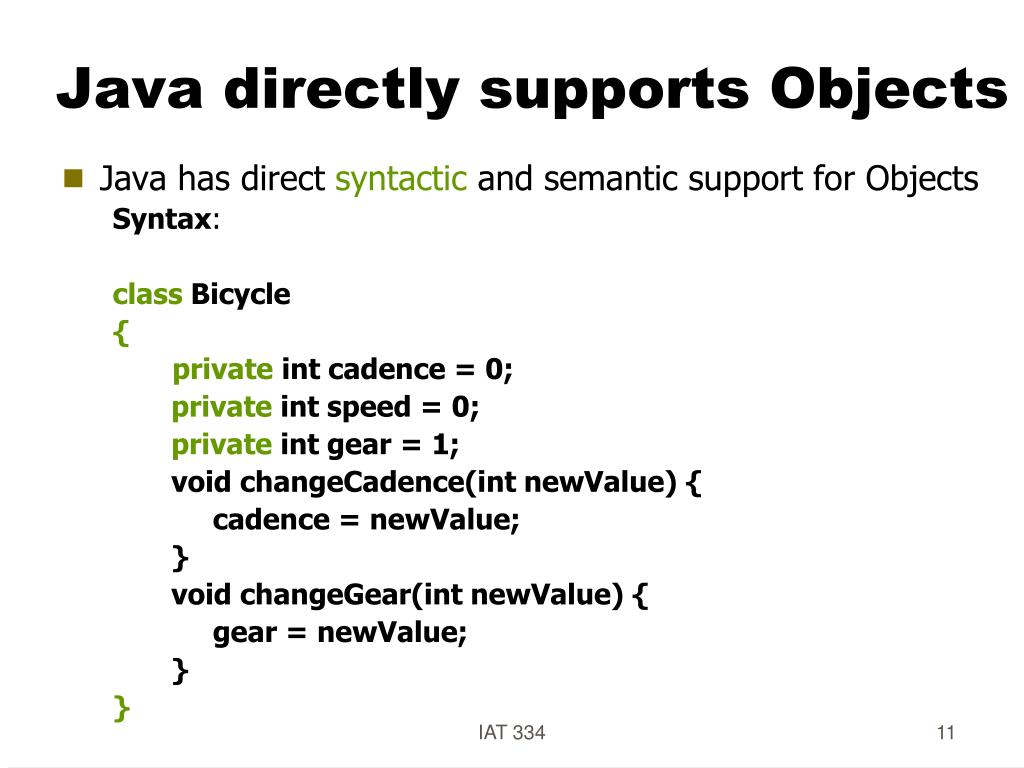 Java directly supports Objects • Java has direct syntactic and semantic support for Objects Syntax: class Bicycle { privateint cadence = 0; privateint speed = 0; privateint gear = 1; void changeCadence(intnewValue) { cadence = newValue; } void changeGear(intnewValue) { gear = newValue; } } IAT 334