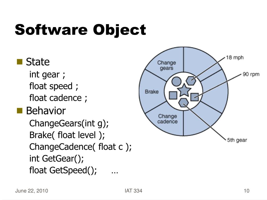 Software Object • State int gear ; float speed ; float cadence ; • Behavior ChangeGears(int g); Brake( float level ); ChangeCadence( float c ); int GetGear(); float GetSpeed(); … IAT 334