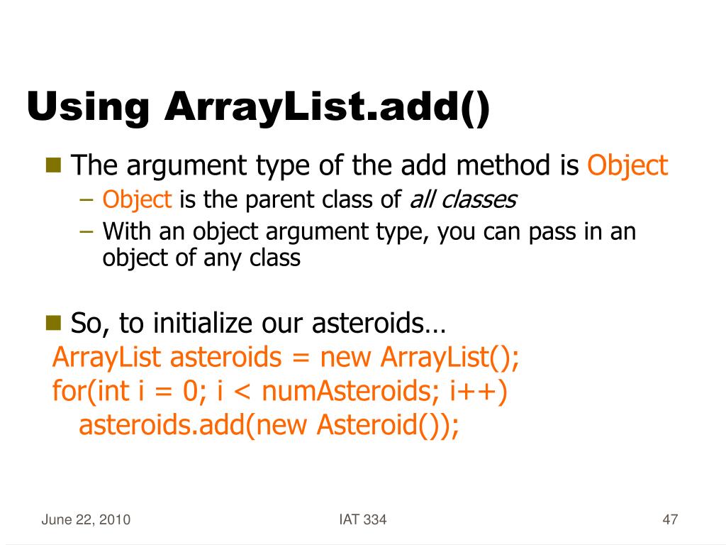 Using ArrayList.add() • The argument type of the add method is Object • Object is the parent class of all classes • With an object argument type, you can pass in an object of any class • So, to initialize our asteroids… ArrayListasteroids = new ArrayList(); for(inti = 0; i < numAsteroids; i++) asteroids.add(new Asteroid()); IAT 334