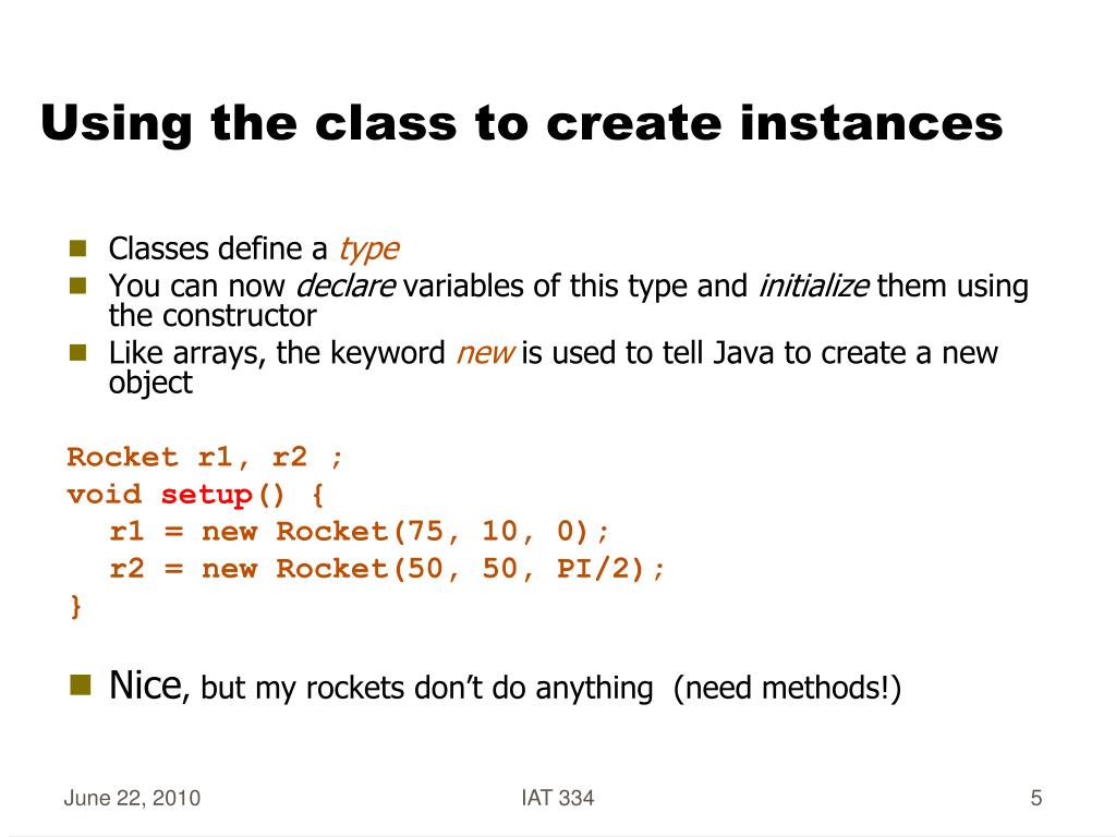 Using the class to create instances • Classes define a type • You can now declare variables of this type and initialize them using the constructor • Like arrays, the keyword new is used to tell Java to create a new object Rocket r1, r2 ; void setup() { r1 = new Rocket(75, 10, 0); r2 = new Rocket(50, 50, PI/2); } • Nice, but my rockets don’t do anything (need methods!) IAT 334