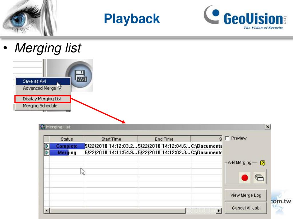 Playback • Main benefits of Viewlog compare to 3rd party video player • Multiple channel playback • Different viewing modes • AVP support • Video edit & merging & auto merging • Back up • Video & audio synchronization