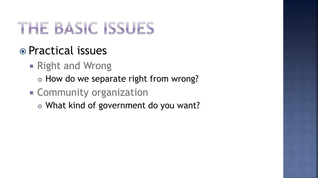 The Basic Issues • Practical issues • Right and Wrong • How do we separate right from wrong? • Community organization • What kind of government do you want?