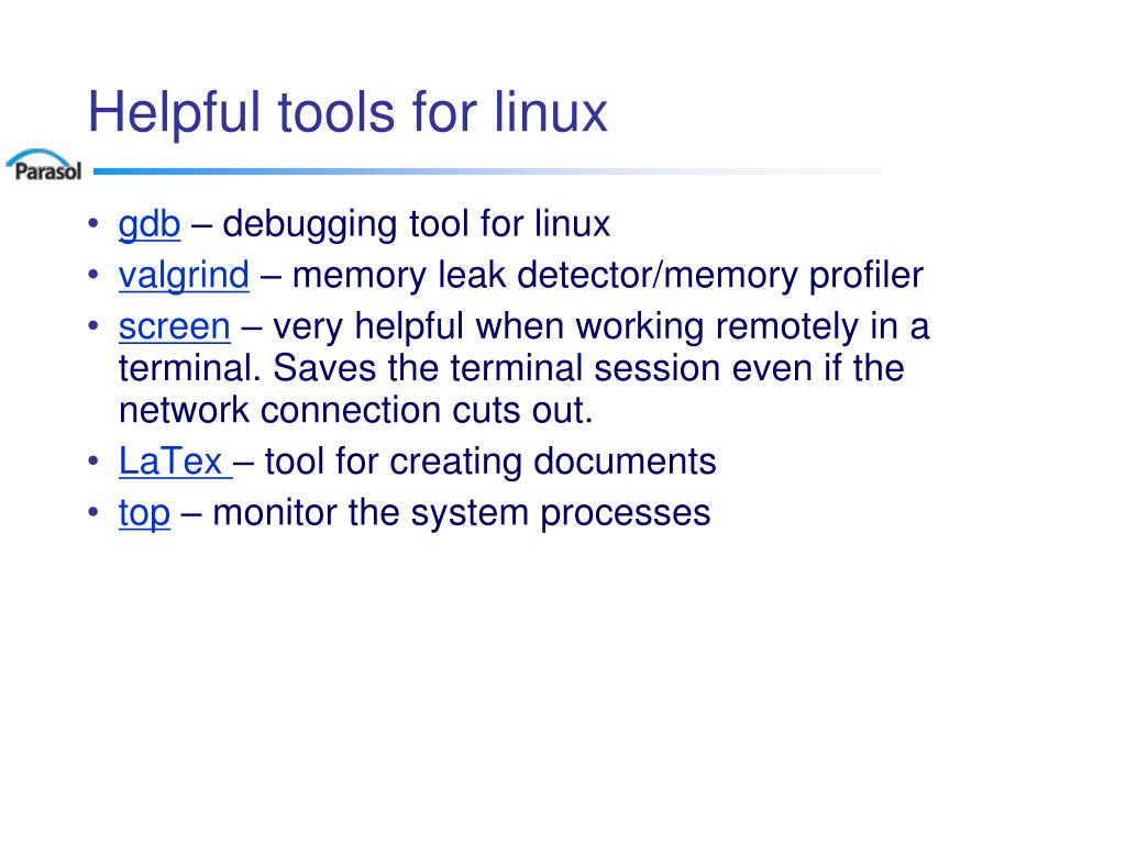 Helpful tools for linux • gdb – debugging tool for linux • valgrind – memory leak detector/memory profiler • screen – very helpful when working remotely in a terminal. Saves the terminal session even if the network connection cuts out. • LaTex – tool for creating documents • top – monitor the system processes