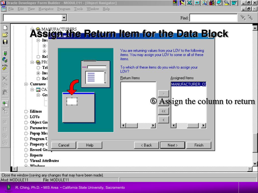 Specify the Return Value Prevents the column from appearing in the LOV manufacturers.manufacturer_code Enter the return value for the data block