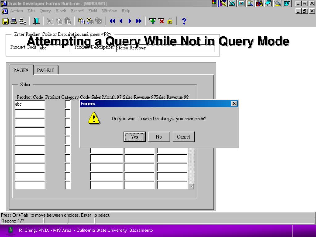 Overcoming Problems with Triggers • Maximize the MDI and form module windows • Enter query mode when the form is launched • Re-enter query mode after every query • Cancel the query if no query is entered when exiting the form • Suppress system alerts and messages