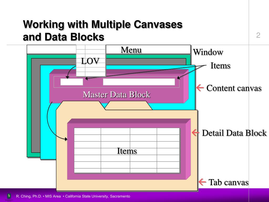 Week 4 February 15. LOV: List of Values Dealing with Errors and Problems OLE: Object Linking and Embedding. LOV. Items. Detail Data Block. Tab canvas. Working with Multiple Canvases and Data Blocks. Menu. Window. Master Data Block. Content canvas. Items.