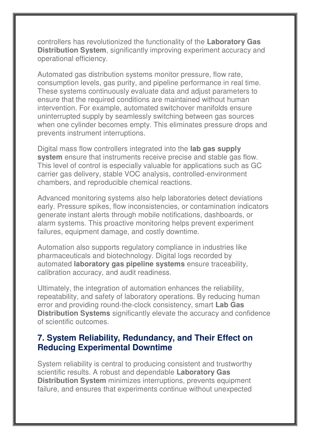 especially critical in analytical laboratories, where even trace impurities can result in false peaks, noisy baselines, or reactive interference. Leaks commonly occur at joints, fittings, valves, regulator connections, and poorly constructed pipeline interfaces. Over time, mechanical wear, thermal expansion, and vibration can worsen small leaks. For this reason, maintaining a leak-tight laboratory gas pipeline system requires not only quality construction but also continuous monitoring and routine maintenance. Effective leak prevention strategies include: 1. Using high-quality valves and fittings 2. Orbital welding instead of threaded joints 3. Regular leak testing using helium mass spectrometry 4. Installing leak detectors in sensitive zones 5. Implementing double-seal mechanisms for high-purity lines 6. Proper torqueing of connectors during installation A well-maintained lab gas supply system prevents external air from entering pipelines, ensuring gas purity remains intact. Air contains moisture, oxygen, hydrocarbons, and particulates—all of which can compromise sensitive experiments. Leak prevention is also a fundamental safety requirement when dealing with flammable, toxic, or oxidizing gases. Furthermore, modern Laboratory Gas Distribution Systems incorporate real-time digital leak detection sensors that track pressure variations and alert operators instantly when abnormalities are detected. This technology allows labs to correct leaks before they affect experimental results. Ultimately, preventing leaks is not just a safety practice—it directly protects the integrity and accuracy of experimental outcomes. A leak- free system equates to stable pressure, consistent flow, and uncontaminated gas delivery, all of which are crucial for achieving precise and dependable scientific results. 6. Automation, Monitoring, and Their Role in Enhancing Experimental Reliability Modern laboratories increasingly rely on automation and digital monitoring to maintain consistent experimental conditions. The introduction of smart sensors, IoT-enabled devices, and automated