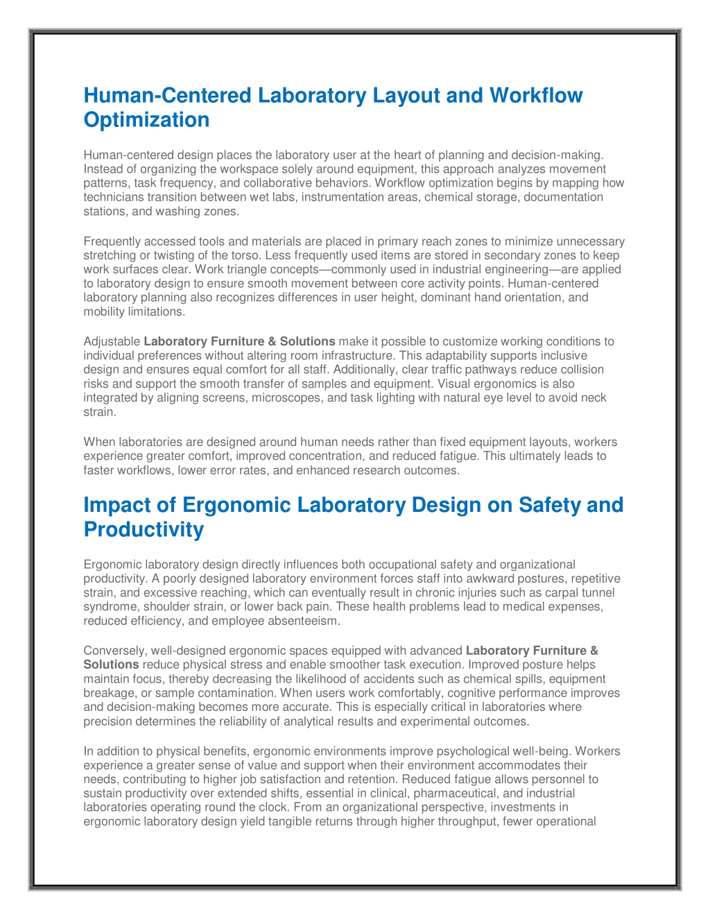 interruptions, and lower insurance claims. Therefore, the science of ergonomics is not merely about comfort enhancements; it plays a decisive role in risk mitigation and performance optimization across laboratory functions. Key Components of Ergonomic Laboratory Furniture Solutions Effective ergonomic design is implemented through carefully selected Laboratory Furniture & Solutions that align with anthropometric data and laboratory functions. Height-adjustable laboratory benches remain fundamental, allowing users to configure work surfaces according to task requirements and personal comfort. Ergonomic laboratory chairs equipped with adjustable lumbar, seat height, and arm support features reduce spinal compression during prolonged sitting. Anti-fatigue mats placed in standing work areas cushion joint impact and enhance circulation. Storage systems are designed with accessible shelf heights to minimize overhead reaching and deep bending. Rounded furniture edges reduce accidental impacts in confined spaces. Integrated monitor arms and adjustable microscope stands bring visual fields to eye level, preventing neck strain and forward head posture. Cable management systems keep power cords organized, eliminating tripping hazards and improving visual clarity around work areas. Chemical-resistant surface materials and spill-containment designs further support safety. Modular laboratory units enable rapid reconfiguration when new equipment is added or departmental functions change, preventing workspace obsolescence. Mobile carts and instrument trolleys assist in transporting sensitive equipment without unnecessary lifting strain. Together, these elements form an ecosystem of laboratory furniture solutions that support both functional efficiency and worker comfort. When such components are strategically combined, they create a coherent ergonomic laboratory infrastructure that adapts to evolving scientific needs without compromising human well- being. Environmental Ergonomics: Lighting, Acoustics, and Indoor Comfort Environmental ergonomics expands beyond physical furniture configuration to encompass lighting, sound control, and indoor climate quality. Appropriate lighting is essential in laboratories where fine visual tasks, microscope analysis, and digital screen monitoring occur daily. Task lighting positioned at the correct angle reduces glare, shadows, and eye strain, while uniform ambient lighting helps maintain circadian comfort. Poor lighting not only impairs accuracy but contributes to headaches and visual fatigue. Acoustic ergonomics addresses the constant noise generated by centrifuges, HVAC systems, alarms, and analytical instruments. Prolonged exposure to elevated sound levels leads to stress, concentration loss, and reduced performance. Acoustic panels, zoning strategies, and sound-absorbing materials help create quieter work environments. Thermal comfort is another vital factor. Laboratories require controlled temperatures for both human comfort and specimen integrity. Poor ventilation results in stale air, discomfort, and potential fume exposure. Advanced Laboratory Furniture & Solutions now integrate airflow management, duct integration compatibility, and localized exhaust provisions to support air quality.