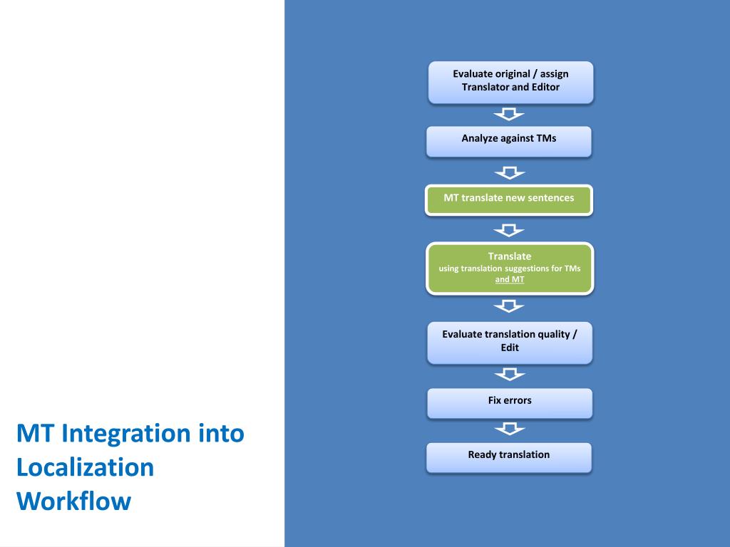 Evaluate original / assign Translator and Editor Analyze against TMs Translateusing translation suggestions for TMsand MT Evaluatetranslationquality / Edit Fix errors Ready translation MT translate new sentences MT Integration into Localization Workflow