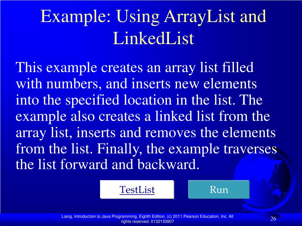 Example: Using ArrayList and LinkedList This example creates an array list filled with numbers, and inserts new elements into the specified location in the list. The example also creates a linked list from the array list, inserts and removes the elements from the list. Finally, the example traverses the list forward and backward. TestList Run