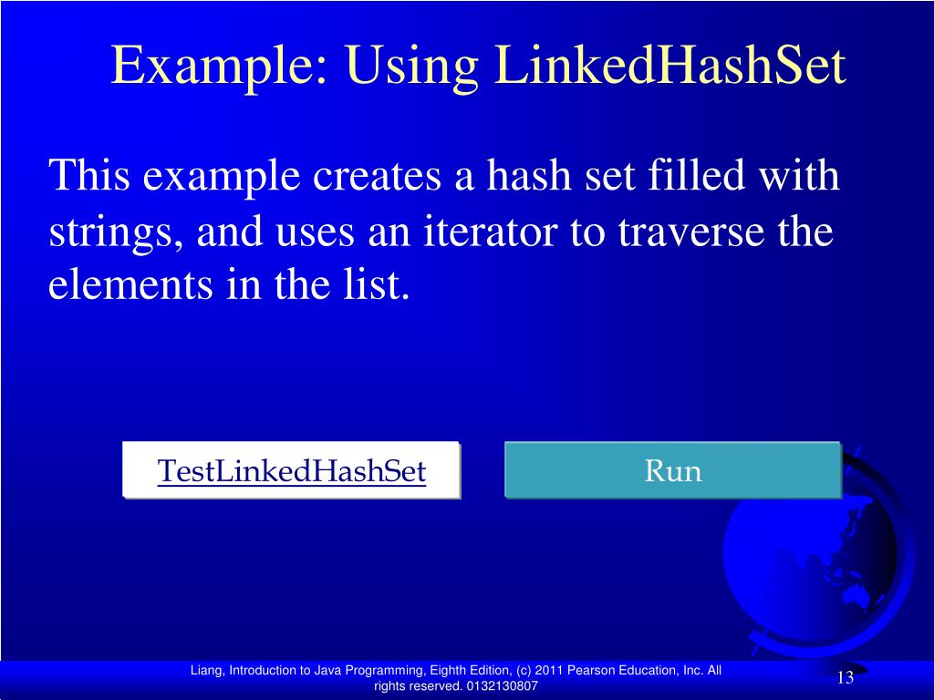 Example: Using LinkedHashSet This example creates a hash set filled with strings, and uses an iterator to traverse the elements in the list. TestLinkedHashSet Run