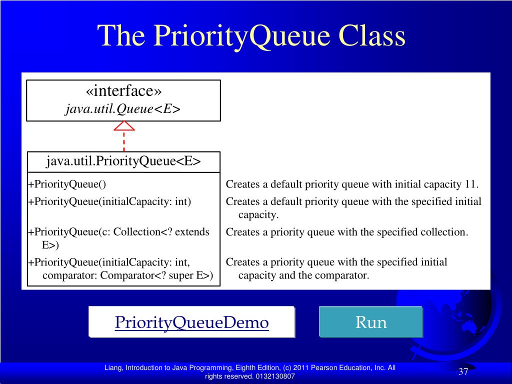 Objectives • To describe the Java Collections Framework hierarchy (§§22.1-22.2). • To use the common methods defined in the Collection interface for operating sets and lists (§22.3). • To use the Iterator interface to traverse a collection (§22.4). • To use the for-each loop to simplify traversing a collection (§22.4). • To explore how and when to use HashSet (§22.4.1), LinkedHashSet (§22.4.2), or TreeSet (§22.4.3) to store elements. • To compare elements using the Comparable interface and the Comparator interface (§22.5). • To explore how and when to use ArrayList or LinkedList to store elements (§22.6). • To use the static utility methods in the Collections class for sorting, searching, shuffling lists, and finding the largest and smallest element in collections (§22.7). • To compare performance of sets and lists (§22.8). • To distinguish between Vector and ArrayList, and to use the Stack class for creating stacks (§22.9). • To explore the relationships among Collection, Queue, LinkedList, and PriorityQueue and to create priority queues using the PriorityQueue class (§22.10). • To tell the differences between Collection and Map, and describe when and how to use HashMap, LinkedHashMap, and TreeMap to store values associated with keys (§22.11). • To obtain singleton sets, lists, and maps, and unmodifiable sets, lists, and maps, using the static methods in the Collections class (§22.12).