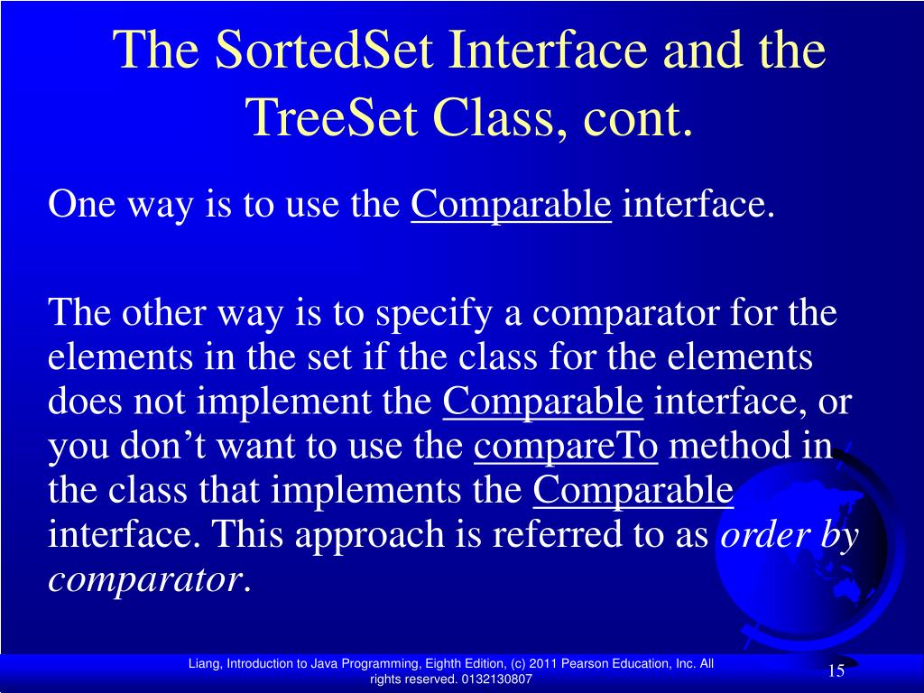The SortedSet Interface and the TreeSet Class, cont. One way is to use the Comparable interface. The other way is to specify a comparator for the elements in the set if the class for the elements does not implement the Comparable interface, or you don’t want to use the compareTo method in the class that implements the Comparable interface. This approach is referred to as order by comparator.