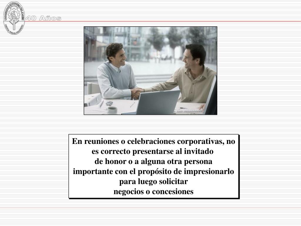 En reuniones o celebraciones corporativas,no es correcto presentarse al invitado de honor o a alguna otra persona importante con el propósito de impresionarlo para luego solicitar negocios o concesiones