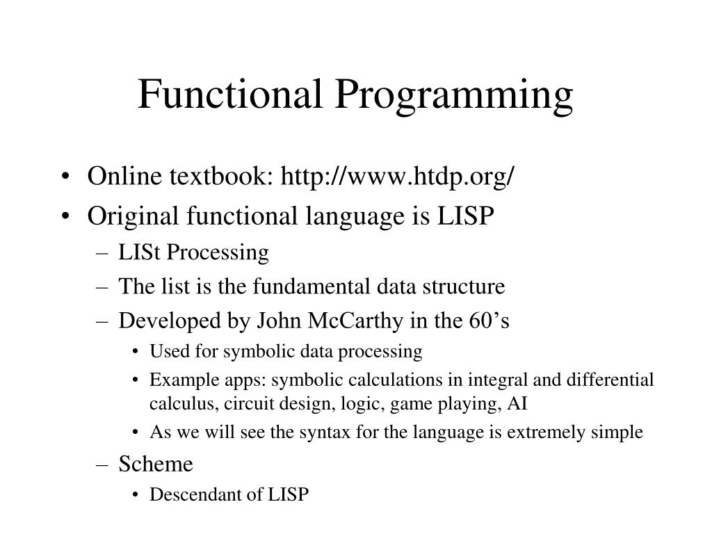 Functional Programming • Online textbook: http://www.htdp.org/ • Original functional language is LISP • LISt Processing • The list is the fundamental data structure • Developed by John McCarthy in the 60’s • Used for symbolic data processing • Example apps: symbolic calculations in integral and differential calculus, circuit design, logic, game playing, AI • As we will see the syntax for the language is extremely simple • Scheme • Descendant of LISP