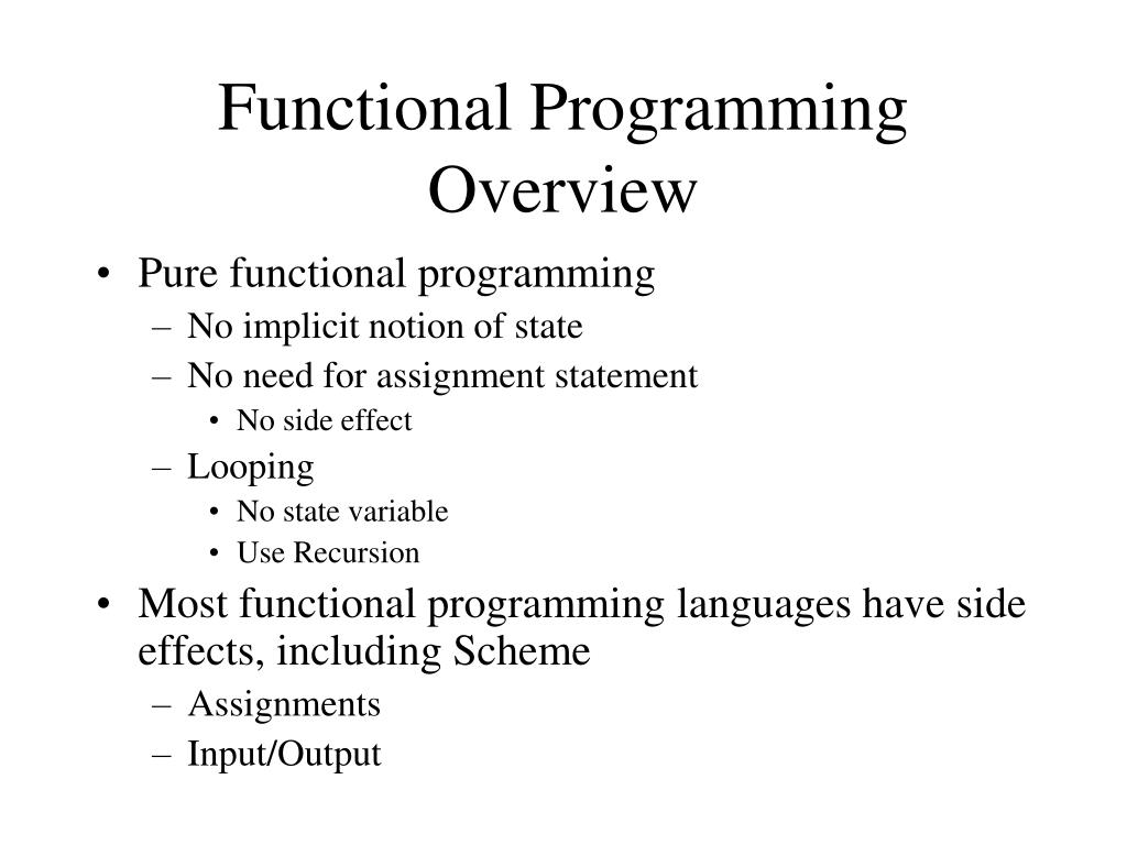 Functional Programming Overview • Pure functional programming • No implicit notion of state • No need for assignment statement • No side effect • Looping • No state variable • Use Recursion • Most functional programming languages have side effects, including Scheme • Assignments • Input/Output