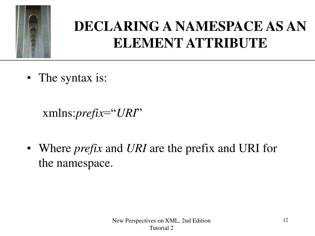 DECLARING A NAMESPACE AS AN ELEMENT ATTRIBUTE • The syntax is: xmlns:prefix=“URI” • Where prefix and URI are the prefix and URI for the namespace. New Perspectives on XML, 2nd Edition Tutorial 2