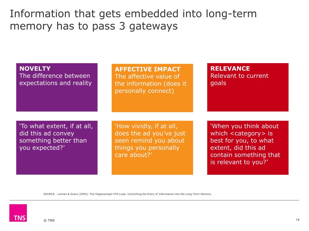 Information that gets embedded into long-term memory has to pass 3 gateways RELEVANCE Relevant to current goals NOVELTY The difference between expectations and reality AFFECTIVE IMPACT The affective value of the information (does it personally connect) ‘To what extent, if at all, did this ad convey something better than you expected?’ ‘How vividly, if at all, does the ad you’ve just seen remind you about things you personally care about?’ ‘When you think about which <category> is best for you, to what extent, did this ad contain something that is relevant to you?’ SOURCE : Lisman & Grace (2005). The Hippocampal-VTA Loop: Controlling the Entry of Information into the Long-Term Memory. 14