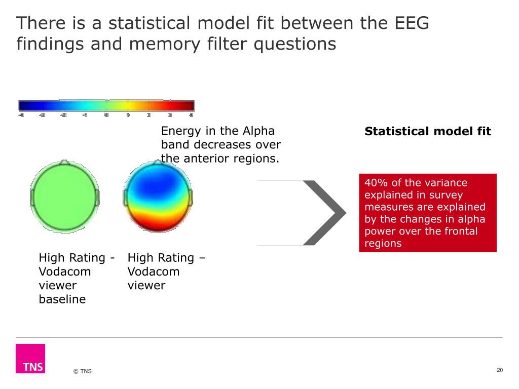 There is a statistical model fit between the EEG findings and memory filter questions Energy in the Alpha band decreases over the anterior regions. Statistical model fit 40% of the variance explained in survey measures are explained by the changes in alpha power over the frontal regions Your text Your text High Rating – Vodacom viewer High Rating - Vodacom viewer baseline 20