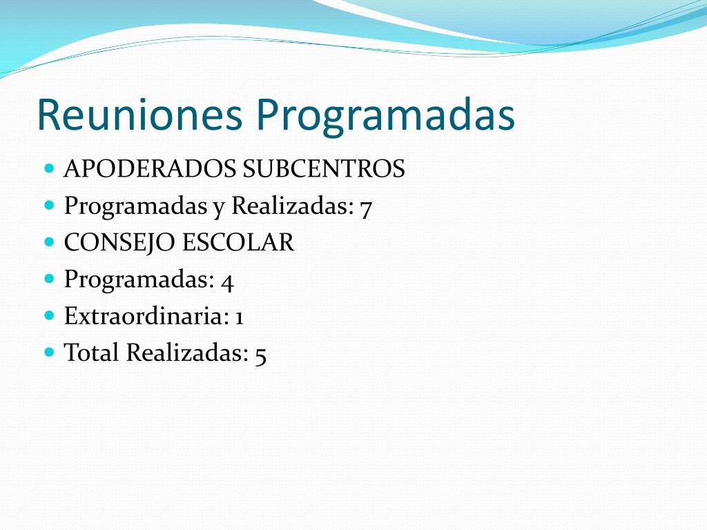 Reuniones Programadas • APODERADOS SUBCENTROS • Programadas y Realizadas: 7 • CONSEJO ESCOLAR • Programadas: 4 • Extraordinaria: 1 • Total Realizadas: 5