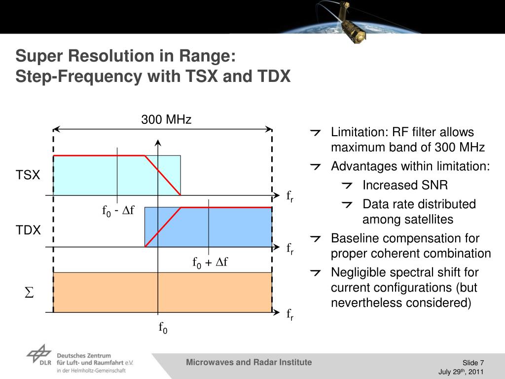 Super Resolution in Range: Step-Frequency with TSX and TDX • Limitation: RF filter allows maximum band of 300 MHz • Advantages within limitation: • Increased SNR • Data rate distributed among satellites • Baseline compensation for proper coherent combination • Negligible spectral shift for current configurations (but nevertheless considered) 300 MHz TSX fr f0 - Df TDX fr f0 + Df fr f0