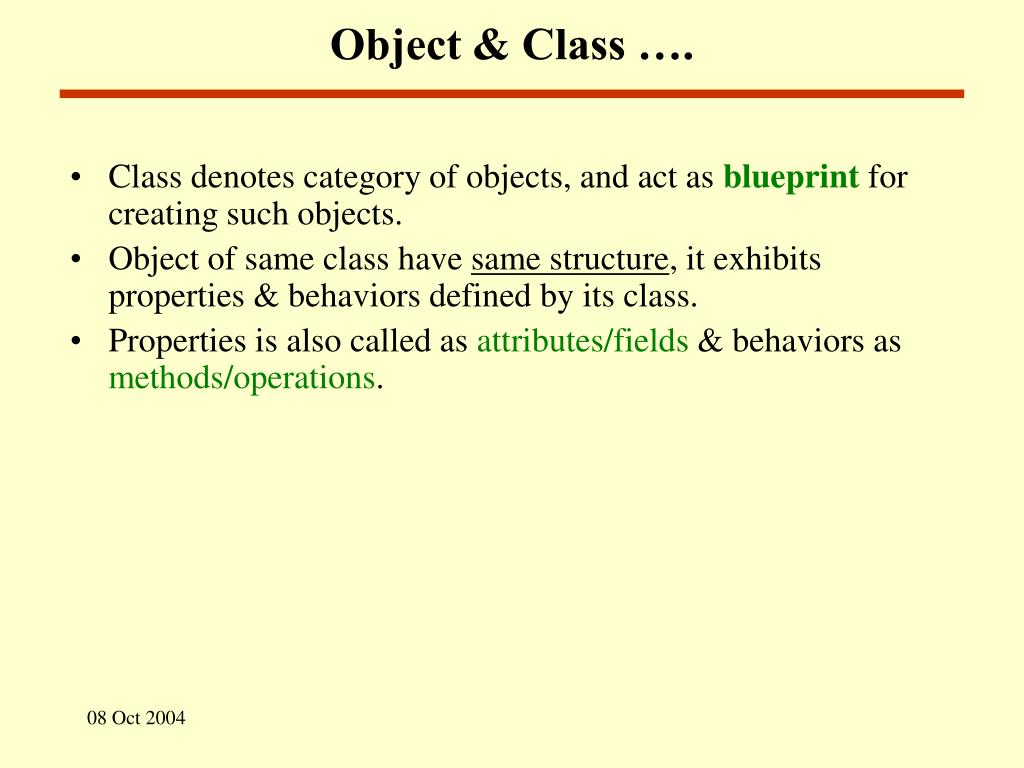 Object & Class …. • Class denotes category of objects, and act as blueprint for creating such objects. • Object of same class have same structure, it exhibits properties & behaviors defined by its class. • Properties is also called as attributes/fields & behaviors as methods/operations.