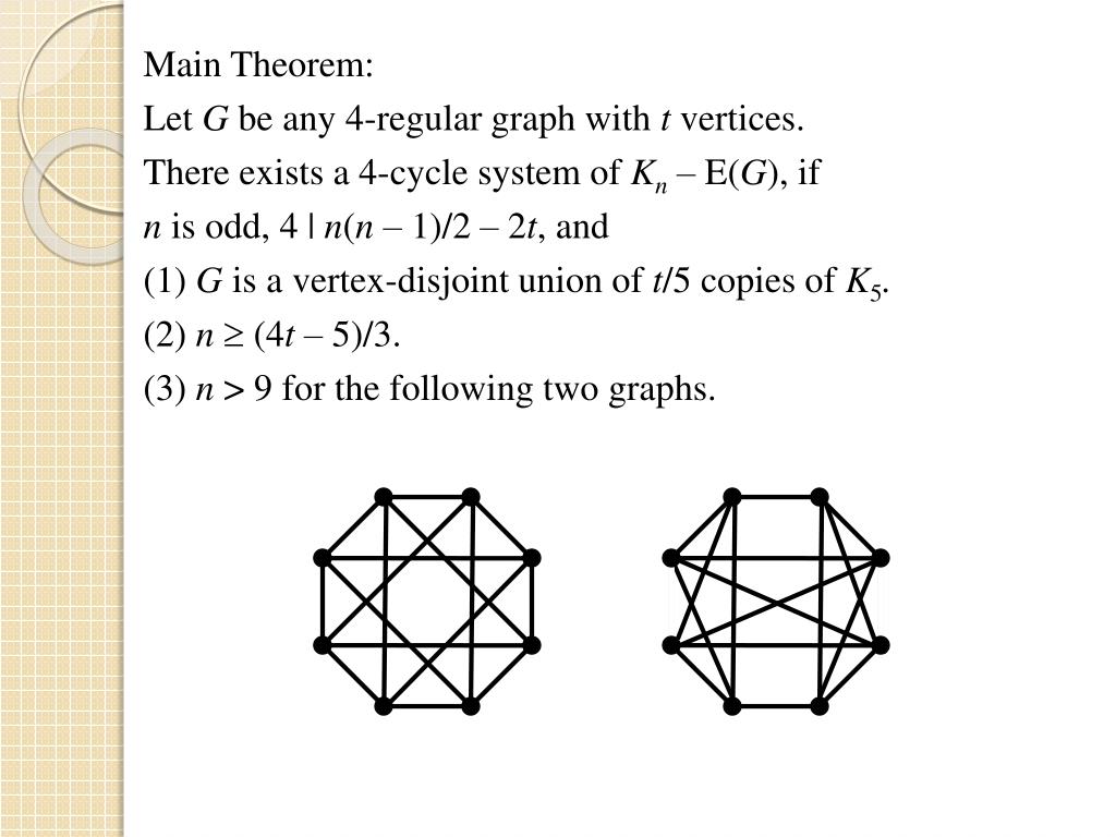Main Theorem: Let G be any 4-regular graph with t vertices. There exists a 4-cycle system of Kn – E(G), if n is odd, 4 | n(n – 1)/2 – 2t, and (1) G is a vertex-disjoint union of t/5 copies of K5. (2) n (4t – 5)/3. (3) n > 9 for the following two graphs.